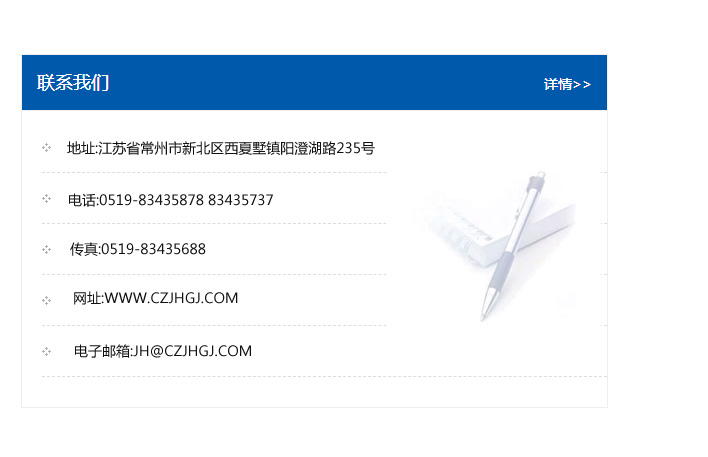 傳真:0519-83435688    郵編:213135    網址:WWW.czjhgj_com.hljhangyuan.com    電子郵箱:JH@czjhgj_com.hljhangyuan.com